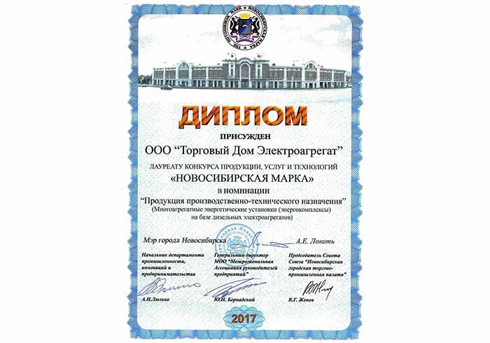 Решением экспертной комиссии от 25.04.2017г. и конкурсной комиссии от 03.05.2017г. ООО "Торговый Дом Электроагрегат" признано лауреатом конкурса «Новосибирская марка» в номинации «Продукция производственно-технического назначения» (Многоагрегатные энергетические установки (энергокомплексы) на базе дизельных генераторов).